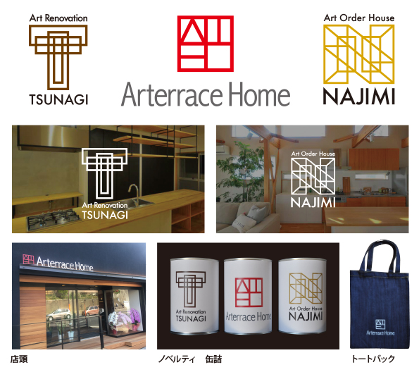 アートテラスホーム株式会社様のコーポレートロゴマーク、リノベーションブランド「TSUNAGI」、注文住宅ブランド「NAJIMI」のロゴマークの制作、マニュアル制作をさせていただきました。